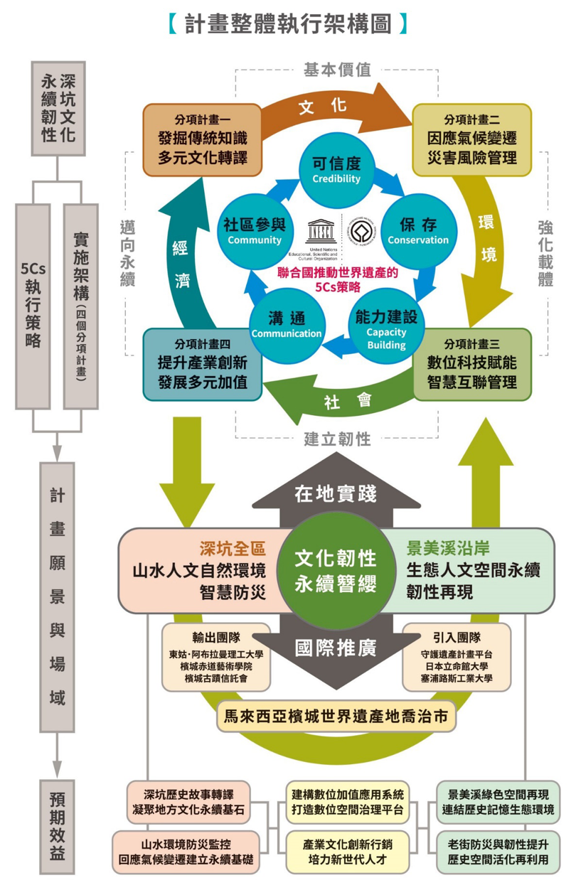本計畫以發展文化韌性為主軸,援引聯合國推動世界遺產5Cs策略(可信度、保存、能力建設、多元溝通、社群參與),以深坑全區山水人文自然環境智慧防災,景美溪沿岸生態人文環境韌性再現為願景,規劃四個分項計畫,推動歷史文化轉譯、建立韌性防災體制、數位科技賦能及產業創新加值:結合國際團隊與國內聯盟學校,導入學校課程強化社區參與,和深坑在地社群共同規劃具人文精神且高智慧化的韌性環境,並於馬來西亞檳城喬治市世界遺產地推廣。