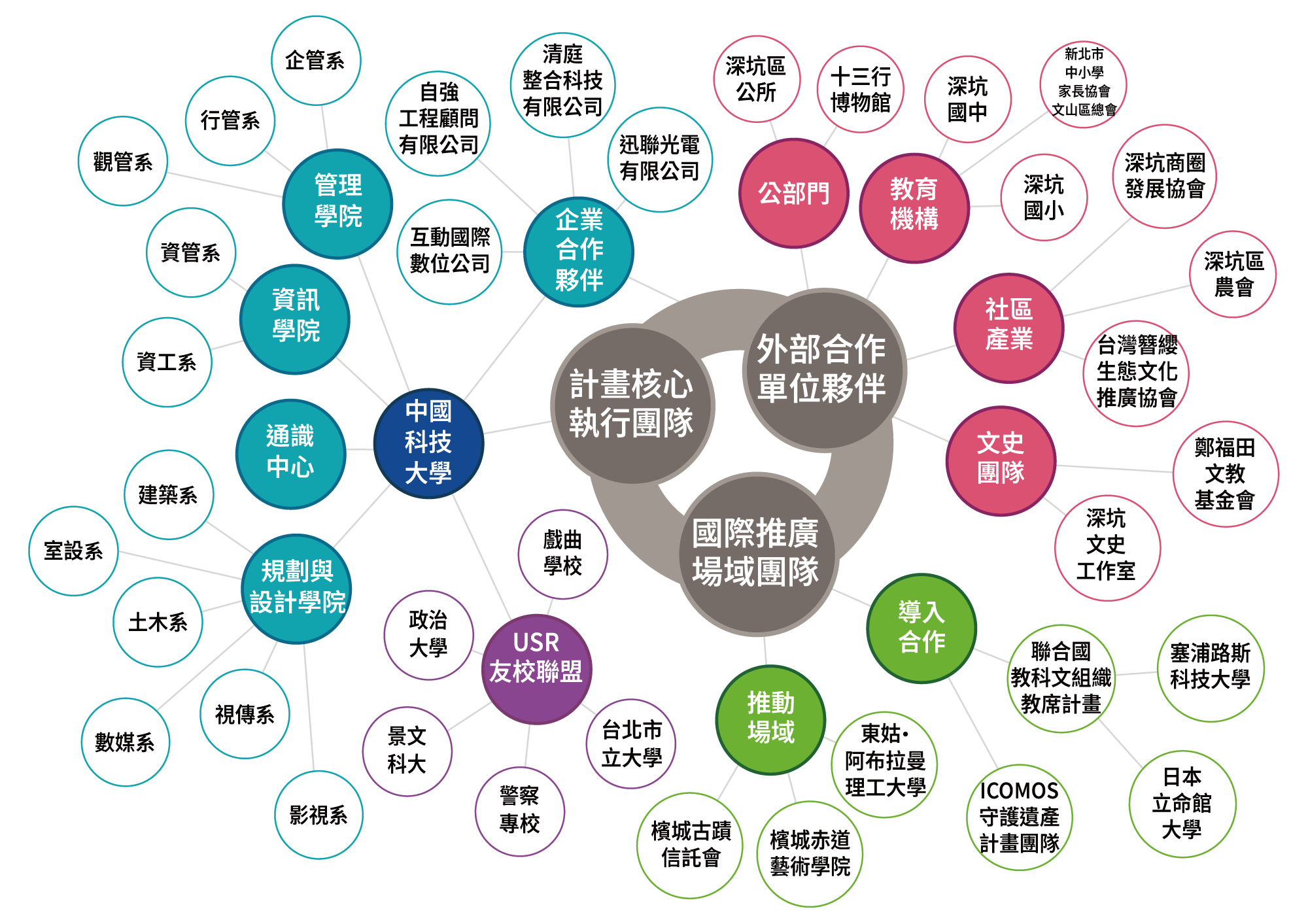 本校地處大文山區,具有緊密的地緣連結,和深坑在地社群長期合作,第三期USR計畫執行過程中,與在地夥伴建立良好互信與互動關係。本校規劃設計、管理及資訊等學院,多項課程長期以深坑為主題結合,學生參與關係密切。本計畫以文化韌性為主軸,與合作夥伴召開多次諮詢會議討論凝聚共識,各項議題具體回應地方要求,透過參與協作共構平台更有效率的執行。
