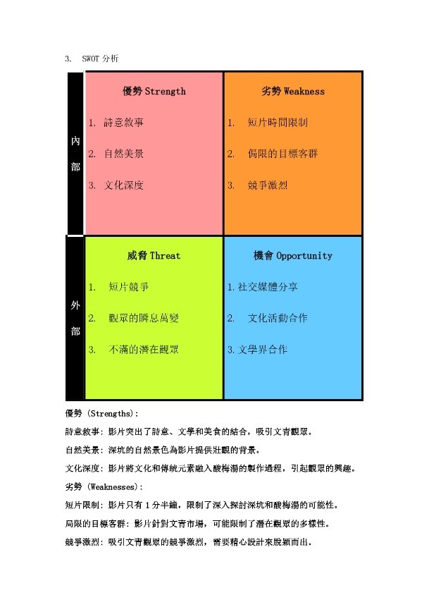 這一情況使我們意識到,深坑的美食文化需要更多的曝光,以滿足不同遊客的需求。這為我們的企劃提供了更多的動力,我們希望透過創作一支旅遊文青短片,不僅突顯深坑的自然風光、文化和歷史,還將關注放在當地獨特的美食,如酸梅湯。我們相信這個短片將吸引更多人前來探索這個美麗的地方,同時為當地的觀光消費市場帶來更多的多樣性和選擇性需求。我們的目標是提高深坑的知名度,讓更多人能夠享受這個令人難忘的地方的魅力。這也是為了紀念深坑的豐富歷史,以及展示它的當代風采。