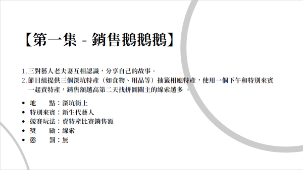 過程中透過口頭報告演練配合結合書面企劃案,學生須深刻理解與深坑人文歷史之選題,分組於課程上台做口頭陳述,產出對深坑在地富有特色的實境節目企劃。