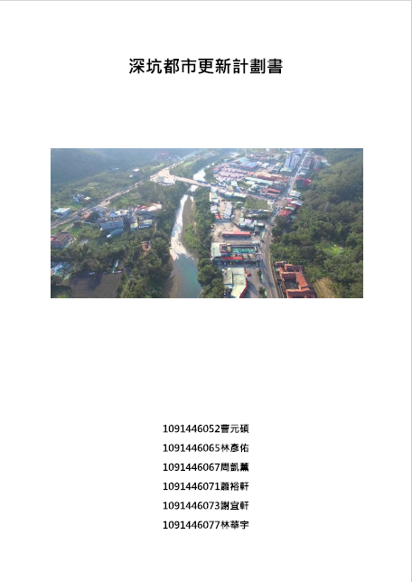 本課程最後由同學合組共同完成一份針對深坑渡船頭及周邊環境的都市更新事業計畫規劃設計報告,每組同學的規劃報告內容包括: 都市計畫相關法規與分析、都市更新法令與分析、深坑的歷史背景與自然特色分析、土地使用計畫、都市設計與景觀計畫、各組同學提出的都市更新規劃設計構想設計圖…等等。