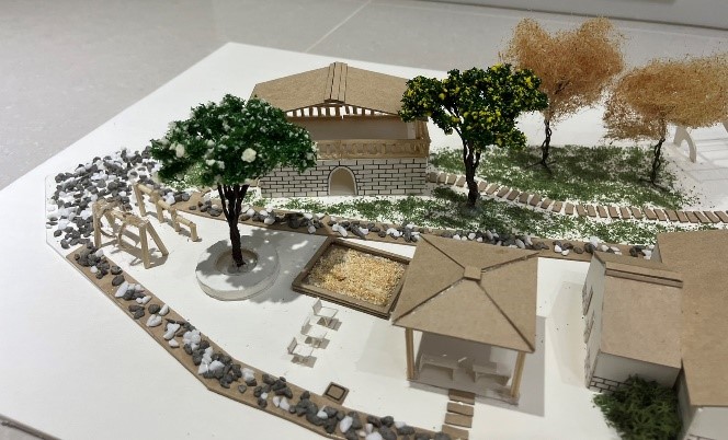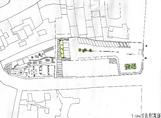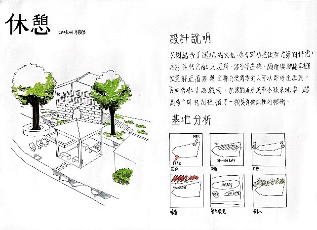 設計概念:本次設計參考深坑街建築特色與當地文化,再將其特色融入基地內設計建築,讓此次建物支援鄰近社區居民與遊客,使方便需要的人可以即時注意到。同時增添了遊戲場,能讓附近居民帶小孩來玩耍,遊戲場中間特別種植了一棵具有標誌性的榕樹。