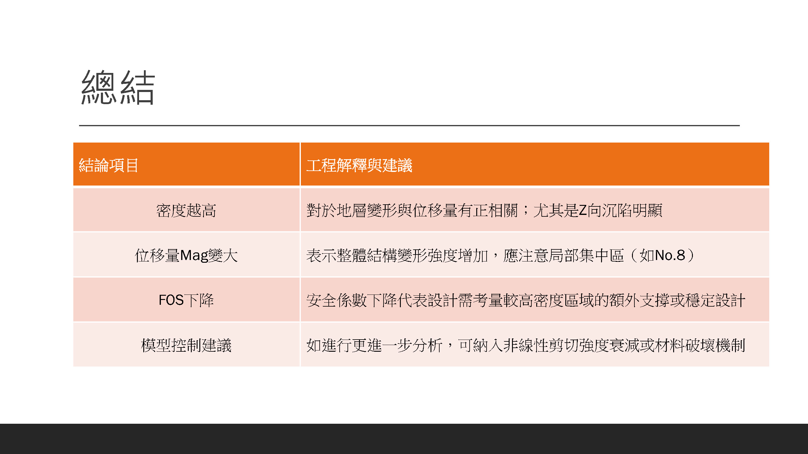 各組進行期末簡報,繳交成果報告。內容包含土壤參數、FLAC 模擬結果、不同方案比較與學習心得等。著重視覺呈現與個人貢獻度。