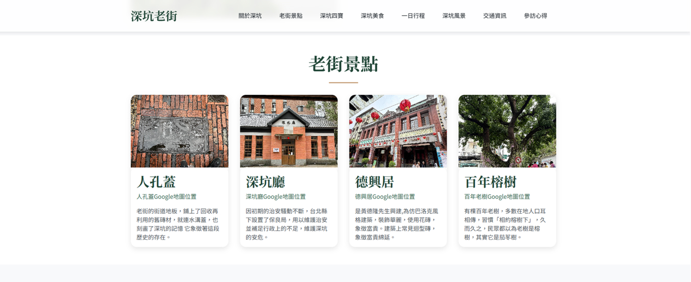 課程中安排第10週前往深坑老街進行實地參訪,學生於活動中拍攝建築、商店、文化意象等素材,作為網站內容的主視覺與內文呈現,並透過小組討論與內容轉譯,完成具有在地特色的文化導覽網站成果
