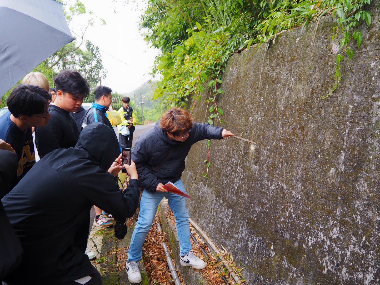 此次課程導覽由深坑人文工作室簡振隆主任,及尚德茶堂曾弘毅老闆協助解說,讓學生提前觀測茶園地貌,進行區域實勘與紀錄,並思索該坡地未來修整的規劃。預計今夏,萬順寮茶園將進行坡地修整工程,因此張偉哲老師現場講解坡地工程的重要考量,包括坡地安全性評估、排水設施設計、防止土壤沖蝕的方法,以及後續維護計畫。師生共同分析坡度變化、土壤穩定度與植被覆蓋狀況,並探討不同條件下的適用工程手法,如階梯式整坡、擋土牆設置、排水溝渠規劃等,如何在強化坡地穩定的同時,兼顧生態與產業需求,以降低災害風險並確保茶園的長遠發展。
