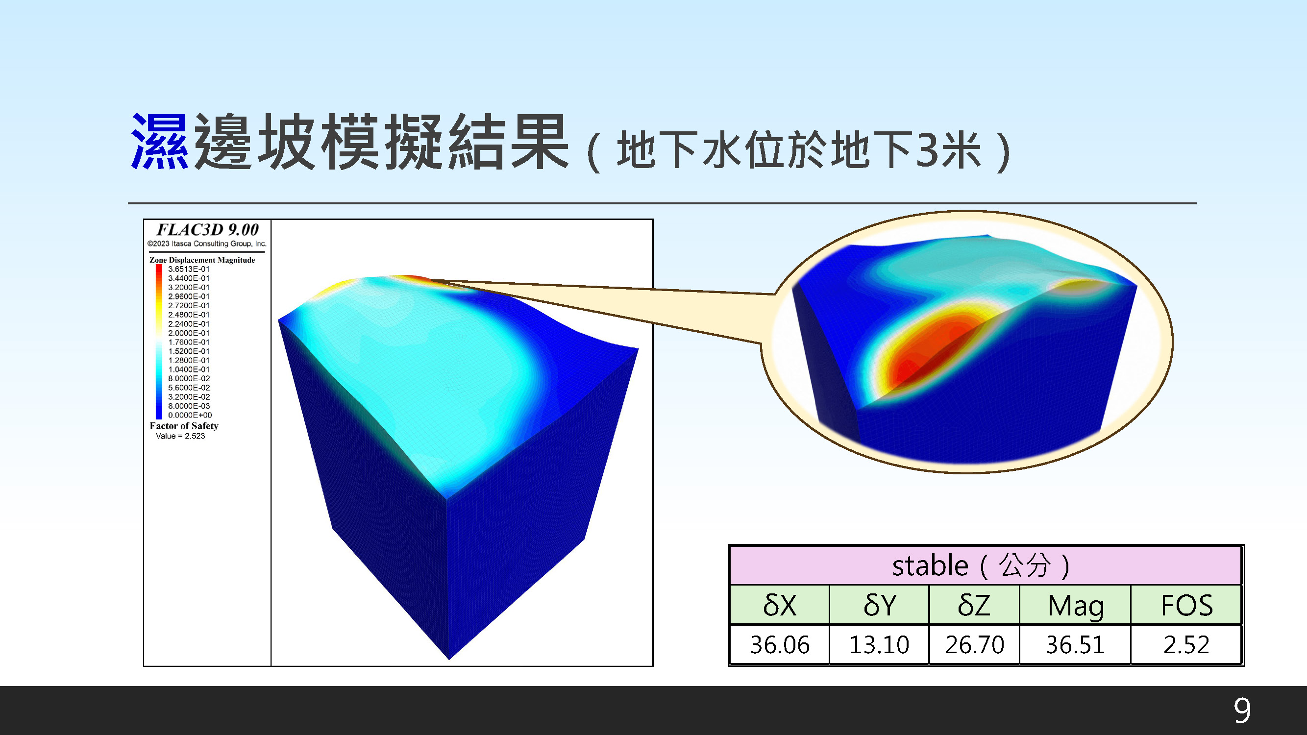 此外,本組亦針對乾、濕邊坡條件進行比較,評估地下水對坡地變形與穩定性的影響。模擬結果顯示,地下水存在僅導致坡地變形量輕微增加及FOS略為下降,整體影響有限。然而,於Y向變形量分析中,乾邊坡局部變形量反較濕邊坡為大,顯現與工程判斷不符之異常現象。經進一步擴大模型範圍分析後,確認此異常係因初始模型邊界設置過小所致,顯示邊界條件設置對數值模擬結果具關鍵影響,需於實務應用時特別審慎。