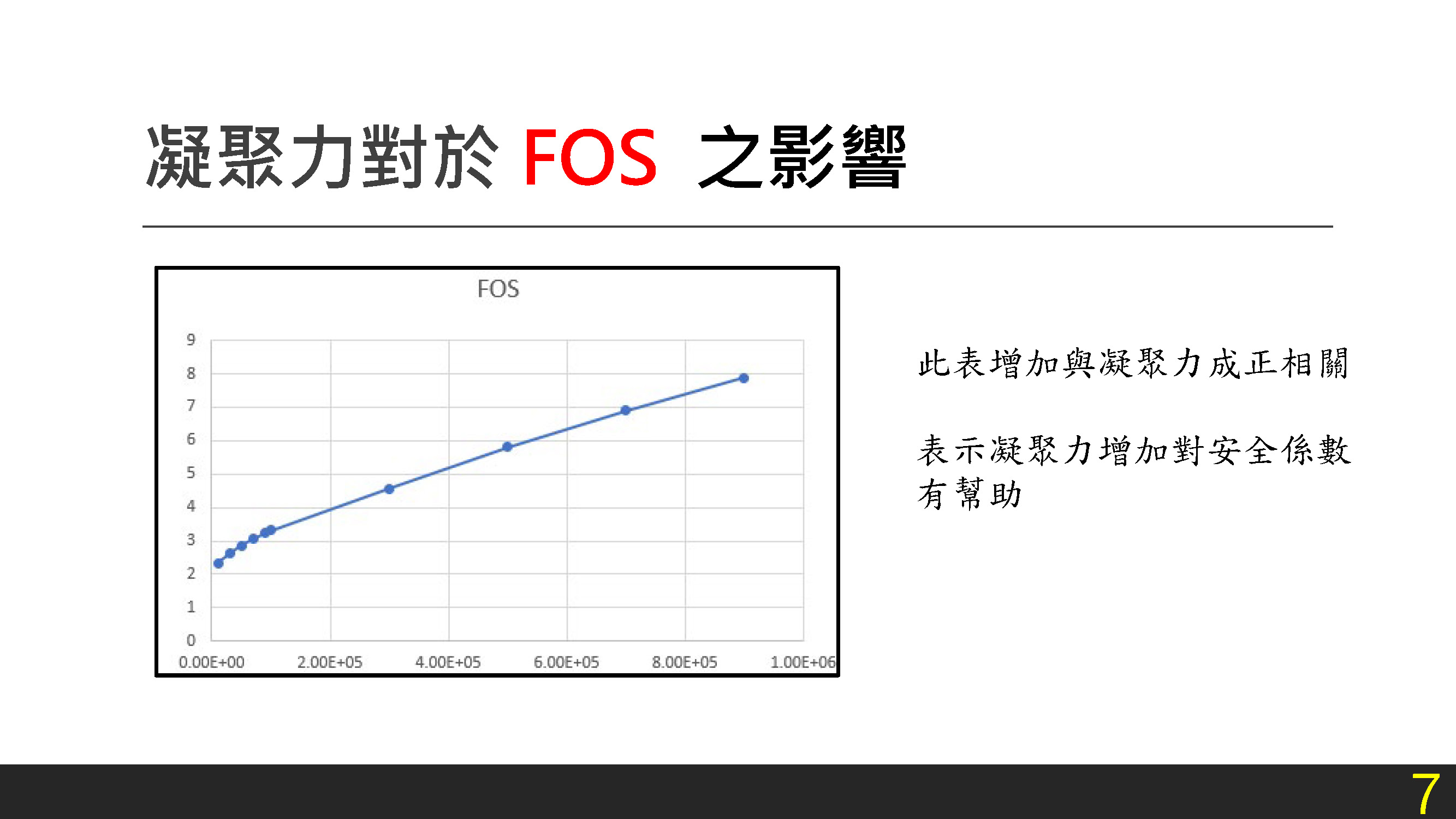 在安全係數(Factor of Safety, FOS)方面,模擬結果呈現穩定線性上升趨勢,FOS 隨凝聚力由 1×10⁴ Pa 緩步提升至 9×10⁵ Pa 的過程中,由約 2 線性提升至約 8,顯示凝聚力對穩定性評估具高度線性控制性,且幅度變化大、反應明確,與其在抗剪強度參數中的主導性一致。