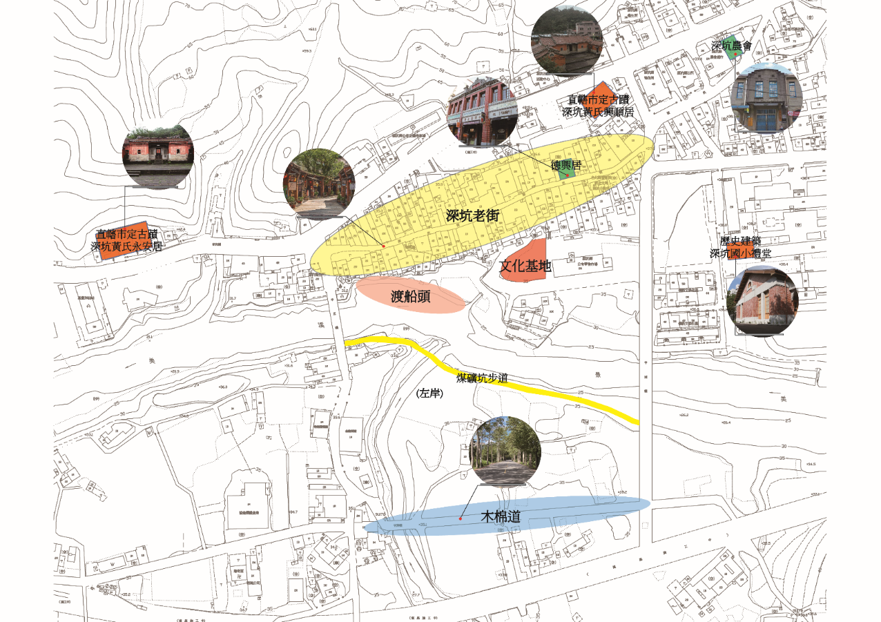 「 渡船頭」綠色開放空間再現,為本計畫的主要目標之一。藉由導入國際觀念結合在地文化特質的韌性社區,是深坑文化永續發展的重要機會。以文化永續觀念推動歷史空間再造,並規劃歷史感的綠色開放空間基礎設施。